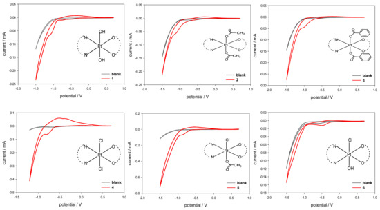 Cyclic voltammograms of Pt(IV) complexes 1–6 (red) recorded at a glassy carbon electrode in buffered aqueous solution (PBS, pH = 7.4, I = 0.1) containing 5 mM NaCl as supporting electrolyte and 5·10−4 M Pt(IV) complex. Scan rate 20 mVs−1. The CV plot of the blank solution is overlaid in grey.