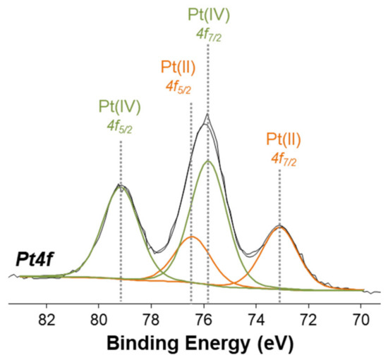 The Pt(IV) complexes were also characterized by X-ray photoelectron spectroscopy (XPS) in order to obtain information on the surface chemical composition and on the platinum speciation. Despite the surface sensitivity of the technique (topmost 5–8 nm), the analysis on homogeneous samples provides useful information on the chemical environment of all detected elements. Figure 7 shows the high resolution Pt4f XP spectrum of complex 2, where the curve-fitting procedure has been applied to discriminate all the peak components. Two doublets were found: one is attributed to Pt(II) (BE Pt4f7/2 = 72.9 ± 0.2 eV and BE Pt4f5/2 = 76.2 ± 0.2 eV), while the second doublet is attributed to Pt(IV) (BE Pt4f7/2 = 75.6 ± 0.2 eV and BE Pt4f5/2 = 79.0 ± 0.2 eV).