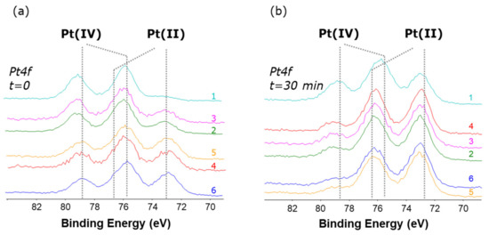 Pt4f XP spectra for complexes 1–6 (a) acquired at the onset of the experiments and (b) after 30 min irradiation. On each spectrum is shown the number that identifies the complex.
