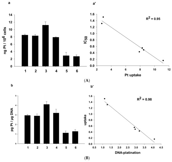 (A). Cellular uptake (a) and correlation between cytotoxicity and cellular platinum levels (a’) in treated A431 cancer cells. A431 cells were incubated for 24 h with 0.5 µM of 1–6. The error bars indicate standard deviation (SD). (B). Nuclear DNA platination levels (b) and correlation between cellular uptake and DNA-platination levels (b’) in drug-treated A431 cells. A431 cells were treated for 24 h with 0.5 µM of 1–6. DNA was extracted and quantified, and the amount of Pt bound to DNA was estimated using graphite furnace atomic absorption spectrometry (GF–AAS). Error bars indicate SD.