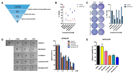 Screening of four CCBs and their effects on CSC sphere formation. (A) Schematic of the screening stage. (B) A2780 and A2780-SP cells were seeded in 96-well plates. After 24 h, 10 µM compound was added to the cells. After 3 days (A2780) or 8 days (A2780-SP), ATP-based cell viability was detected by luminescence assay. (C) A2780 and A2780-SP cells were seeded at 10,000 cells per well in 6-well plates. After 3 days, 10 µM compound was added to the cells in each well. At 7 days after compound treatment, they were stained with 5% crystal violet (left panel). Dye was extracted using 0.1% SDS and then quantified using a spectrophotometer at 590nm (right panel). (D) A2780-SP cells were seeded in ultra-low attachment round bottom 96-well plates. After 24 h, apigenin and four CCBs were added to the cells at each concentration. After 8 days, sphere cells were imaged under a microscope (left panel) and the sphere size was quantified (right panel). (E) SKOV3-SP cells were seeded in ultra-low attachment round bottom 96-well plates. After 24h, apigenin and four CCBs were added to the cells at 10 µM. After 8 days, ATP-based cell viability was detected by luminescence assay. Data are expressed as mean ± SD of three independent experiments; * p < 0.05, ** p < 0.01, *** p < 0.001; ns—not significant compared with DMSO.