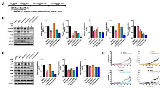 AKT and ERK signaling pathways are important to maintain the stemness of normal stem cells and CSCs [21,22,23,24], and CCBs are known to play a role in regulating AKT and ERK signaling [21,25]. Therefore, we monitored the protein phosphorylation levels of AKT, ERK, and p38 in CSCs after treatment with the four selected CCBs. Manidipine, lomerizine HCl, and benidipine HCl significantly reduced the phosphorylation of AKT and ERK proteins (Figure 2C). Lacidipine did not affect the phospho-AKT level, but reduced ERK phosphorylation (Figure 2C). None of the four compounds affected the phospho-p38 protein level (Figure 2C). However, in A2780 cells, most CCBs barely reduced p-AKT, p-ERK, and p-p38 levels (Figure S5B). Only manidipine and lacidipine partially decreased the p-ERK and p-p38 level, respectively. These results suggest that the four CCBs selectively affect CSCs. In addition, we determined whether the four CCBs affect the proliferation of A2780-SP cells using real-time live imaging. All four compounds at 10 µM inhibited the proliferation of A2780-SP cells by more than 3-fold (Figure 2D). These data suggested that the selected CCBs can destroy the stemness of CSCs and inhibit the proliferation of CSCs by regulating AKT and ERK signaling pathways.
