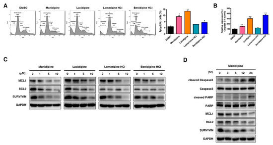 CCBs induced apoptosis in ovarian CSCs. (A) Cell cycle was analyzed by PI staining and apoptosis was analyzed in CCB-treated cells by flow cytometry (left panel). The results are expressed in a graph (right panel). (B) Caspase 3/7 activity in A2780-SP cells treated with CCBs. (C) Expression of MCL1, BCL2, and SURVIVIN was detected in CCB-treated cells (0, 1, 5, and 10 µM for 24 h) by immunoblotting. (D) Expression of pro- and anti-apoptotic proteins was detected in manidipine-treated cells (10 µM for 0, 3, 6, 12, and 24 h) by immunoblotting. Data are expressed as mean ± SD of two or three independent experiments; * p < 0.05, ** p < 0.01, *** p < 0.001; ns—not significant compared with DMSO.