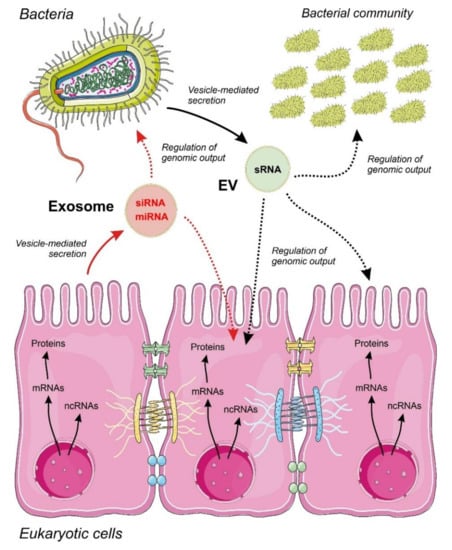 In eukaryotic cells, external small RNAs that are transported by EVs are internalized either by vesicle endocytosis or by membrane fusion and posterior release of vesicle cargo into the cytoplasm. The mechanisms of a hypothetical targeting of ncRNA-containing vesicles to specific cells remain unknown. Signals that are transported by small ncRNAs (miRNAs, siRNAs or bacterial sRNAs) and targeting eukaryotic cells are expected to function by the insertion of these external molecules into the canonical regulatory pathways that are mediated by ncRNAs in the cell. Experimental evidence suggests that foreign regulatory small ncRNAs would function by base pairing to their molecular targets, which are usually mRNAs as well as ncRNAs []. It is important to note that the regulatory action of any small ncRNA is strictly dependent on the presence of the corresponding cognate target in the recipient cell. The same small ncRNA could have different regulatory effects, depending not only on the targeted cell, but also on its physiological state. Moreover, small ncRNAs would also need the help of specific RNA binding proteins that will be responsible for the final regulatory action.