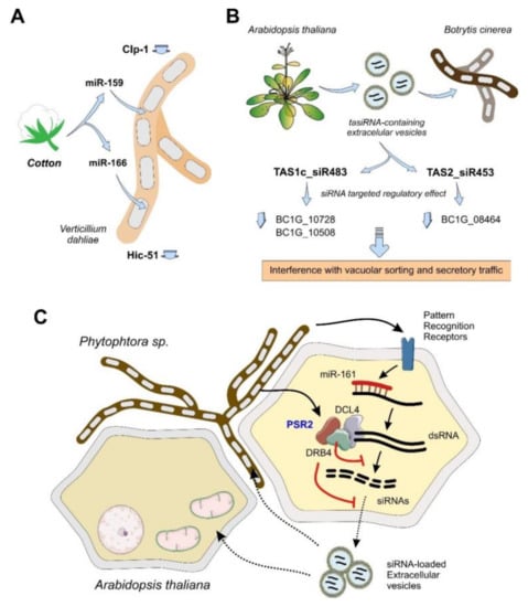 In plant holobionts, the intervention of pathogenic species could be responsible for holobiont imbalance []. In this context, ncRNAs are essential players for the relationships established between the host and the colonizing pathogens. (A), cotton plants counteract infections by the fungal pathogen V. dahliae by secreting specific miRNAs (miR-159 and miR-166) that inhibit the expression of the virulence factors Clp-1 and Hic-51 []. (B), A. thaliana plants are able to control the growth of pathogenic fungi as B. cinerea by using a defense mechanism that is based on tasiRNAs (a specific group of regulatory ncRNAs generated by the processing of long dsRNAs by Dicer-like enzymes), that will target a group of genes required for vesicle trafficking and secretion in the fungal pathogen. Vesicle trafficking is essential for fungal colonization of the plant, and the regulatory effect of the plant tasiRNAs will result in a control of the invading pathogen []. (C), fungal pathogens from the Phytopthtora genus have an extremely sophisticated ncRNA machinery for a functional crosstalk with their host plants. Plant cells can recognize the colonization by the fungal pathogen by the involvement of surface pattern recognition receptors (PRRs). The PRRs will lead to an overexpression of miR-161 that will be responsible for the biogenesis of siRNAs via dsRNA amplification and a Dicer-dependent mechanism. The siRNAs can target the genome of the infecting fungus when transported by extracellular vesicles. The Phytophtora fungus, can counteract this defense mechanism by the secretion of PSR2, a protein that inhibits the production of defensive siRNAs by interaction with the Dicer-associated dsRNA processing complex [].