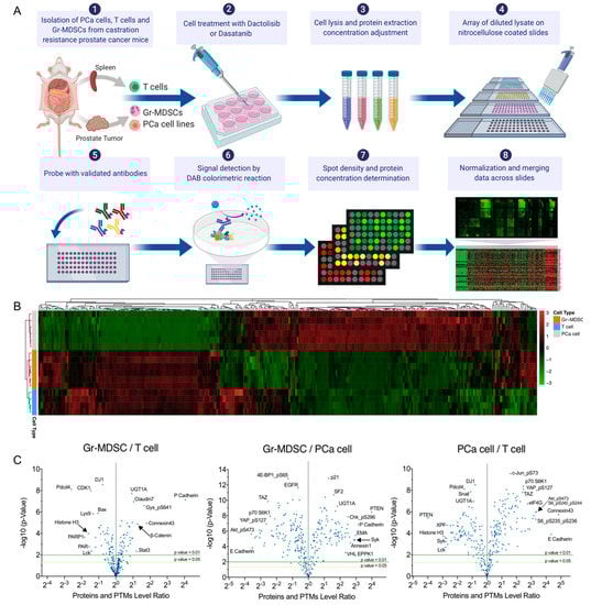 RPPA profiling of PCa cells, Gr-MDSCs and T cells of the CPPSML model of CRPC. (A) Workflow of cell isolation and RPPA. The figure was created with BioRender.com. (B) Unsupervised hierarchical clustering of PCa cells, T cells and Gr-MDSCs (untreated or DMSO-treated) with normalized RPPA signals. Each row represents a biological replicate sample and each column corresponds to an antibody in the RPPA array. (C) Volcano plots showing the pairwise fold change comparisons of the normalized protein or PTM levels among the three cell types. p values were calculated by Student’s t-test. Arrows help to pinpoint proteins of interest of whose labels were partly overlapped with adjacent labels.