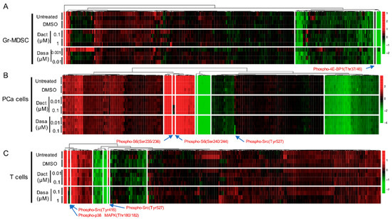 Heatmaps showing the normalized protein expression signals under no treatment or 2 h treatment of DMSO, Dactolisib or Dasatinib (at indicated concentration) for Gr-MDSCs (A), PCa cells (B), and T cells (C). Proteins with significant changes under either inhibitor treatment are labeled with arrows. Dact = Dactolisib, Dasa = Dasatinib. Arrows highlight the differentially expressed proteins or PTMs by the inhibitor treatment.