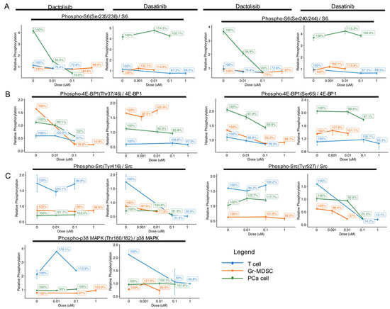 To corroborate the results from RPPA, we detected the dysregulated proteins and PTMs by western blot. Dactolisib strongly inhibited S6 phosphorylation at Ser235/236 and Ser240/244 in Gr-MDSCs and PCa cells (Figure 4A,B). S6 and phospho-S6 were barely detectable in T cells (Figure 4C). Dactolisib also suppressed 4E-BP1 phosphorylation at Thr37/46 and Ser65 in Gr-MDSCs and PCa cells (Figure 4A,B), yet 4E-BP1 phosphorylation in T cells was largely resistant to Dactolisib treatment. In contrast to Dactolisib, the effect of Dasatinib on phosphorylation of S6 or 4E-BP1 in all three cell types was much weaker or essentially absent (Figure 4A–C). However, Dasatinib (but not Dactolisib) inhibited p38 MAPK phosphorylation at Thr180/182, Src phosphorylation at both Tyr416 and Try527 and Lck phosphorylation at both Tyr394 and Tyr505, preferentially in T cells (Figure 4C). As an internal control, CD3ε remained unchanged in T cells by the drug treatments (Figure 4C). It is worth noting that the moderate inhibitory effect of Dasatinib on Src phosphorylation in Gr-MDSCs and PCa cells was only observed for Tyr527 but not Tyr416 (Figure 4A,B). Overall, these results validated the RPPA results and supported (1) the selective downregulation of phospho-S6 and phospho-4E-BP1 by Dactolisib in Gr-MDSCs and PCa cells, and (2) the preferential downregulation of phospho-Src and phospho-p38 MAPK by Dasatinib in T cells.