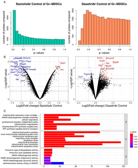 Dactolisib, but not Dasatinib, downregulated mitochondrial respiration genes in Gr-MDSCs based on microarray analysis. (A) p value distributions for differentially expressed probes between Dactolisib and DMSO control, or between Dasatinib and DMSO control based on unpaired t-test. (B) Volcano plots showing differentially expressed genes by Dactolisib or Dasatinib treatment on Gr-MDSCs. Some of the most significantly altered genes are labeled. Blue/Red: downregulated/upregulated genes by inhibitor treatment. (C) GO term over-representation analysis of downregulated genes by Dactolisib treatment, highlighting the enrichment of genes involved in mitochondrial respiration activity. BP: biological process; CC: cellular component; MF: molecular function.