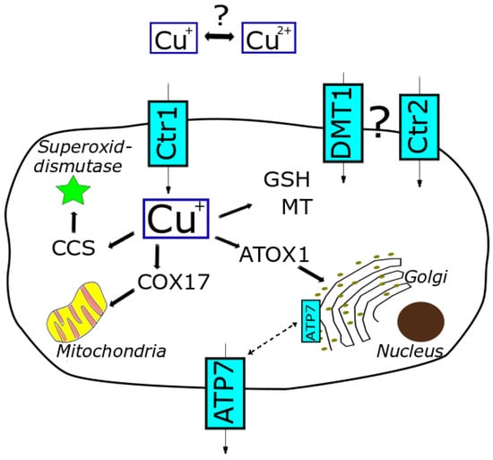 Natural sources of copper are, among others, meat, vegetables and cereals, but exposure also derives from industrial application []. Copper absorption occurs in the small intestine, mainly in the duodenum, with an efficiency of up to 60% []. Via the portal vein, copper is transferred to the liver and further distributed via the bloodstream throughout the entire organism including muscles and brain. In the serum, approximately 90% of the copper is bound to the copper-binding protein ceruloplasmin. Besides, copper is also bound to albumin and transcuprein [,,]. Copper in its free form can be potentially harmful due to its high chemical redox activity. To prevent uncontrolled redox activity under physiological conditions, copper is almost exclusively associated with transport proteins and its free levels are maintained at low levels (10−18 M; amounts to less than one free copper ion per cell) [,].
