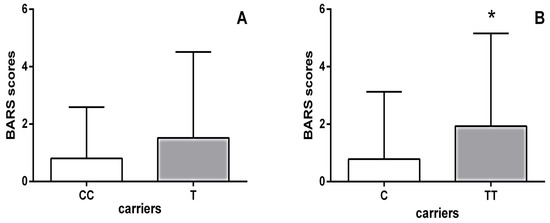BARS scores of haloperidol-treated schizophrenia patients subdivided according to their HTR1B rs13212041 polymorphism status: (A) carriers of the homozygous CC genotype (0.800 ± 1.789) vs. carriers of the T allele (1.517 ± 2.996); (B) carriers of the homozygous TT genotype (1.931 ± 3.228) vs. carriers of the C allele (0.785 ± 2.341). * p = 0.002; Mann–Whitney test, TT vs. C carriers.