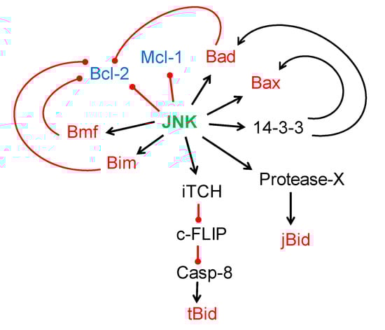 In addition to regulating the levels of the expression of apoptotic proteins, JNK/p38 MAPK cascades also regulate their functions directly in both extrinsic and intrinsic apoptotic pathways. The extrinsic pathway, or death-receptor pathway, can induce caspase-8 activation and apoptosis independently of Bcl-2 family members. However, in some cells, the extrinsic pathway can induce caspase-8-mediated cleavage of the pro-apoptotic BH3-only protein Bid (BH3 interacting-domain death agonist). The C-terminal truncated form of Bid (tBid) translocates to mitochondria and induces the release of cytochrome c, which in turn induces further caspase activation (caspase-9 and the effector caspases-3, -6, and -7) through the intrinsic pathway []. Therefore, the extrinsic and intrinsic pathways of apoptosis can converge in the mitochondria. It has been reported that JNK phosphorylates the E3 ubiquitin ligase iTCH (itchy homolog), which in turn promotes ubiquitination-mediated degradation of the caspase-8 inhibitor c-FLIP (cellular FLICE (FADD-like IL-1β converting enzyme) inhibitory protein) []. Intriguingly, TNFα (tumor necrosis factor alfa) treatment activates the JNK cascade, which induces caspase-8-independent cleavage of Bid; the resultant fragment of Bid (jBid), distinct to t-Bid, translocates to mitochondria and selectively promotes the release of Smac/DIABLO (second mitochondria-derived activator of caspases/direct inhibitor of apoptosis protein-binding protein with low pI) []. It has also been reported that JNK protects Bid from caspase-8-mediated cleavage through the phosphorylation of Bid at Thr59, but full-length phosphorylated Bid is cleaved by an unknown protease to generate jBid []. More studies are necessary to identify this protease and uncover its function during cell death.