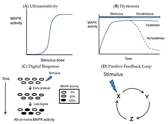Functioning as cellular sensors and switches, MAPKs play a critical role in the regulation of cell fate decisions. Cellular sensors must have signaling properties well suited for the processing and propagation of stimuli that promote irreversible processes. Basically, these properties are: (1) Ultrasensitivity, meaning that a small increase in stimulus produces a very large response after a threshold is crossed; (2) hysteresis, a form of biochemical memory reflected in the sustained activation of MAPK when the stimulus has disappeared; and (3) digital response, meaning an all-or-none response at a single cell level [] (Figure 2).