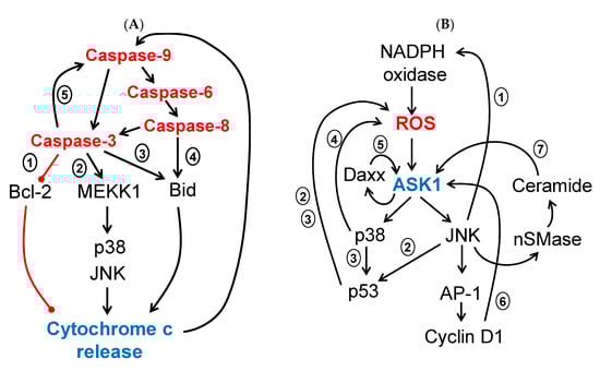 Besides ROS, ceramide is another second messenger associated with apoptosis. It has been reported that ceramide can initiate apoptosis through Rac1- or ASK1-regulated activation of the JNK/p38 MAPK cascades []. The JNK signaling pathway stimulates ceramide generation and promotes apoptosis by phosphorylation of neutral sphingomyelinase (nSMase) []. Therefore, a positive feedback loop exists between JNK activation and ceramide production. In summary, different positive feedback loops could promote sustained activation of the JNK/p38 signaling pathways (Figure 3B).
