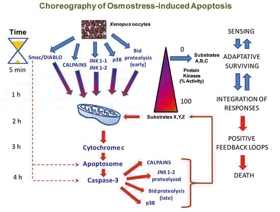 During the last years, we analyzed the mechanisms that regulate osmostress-induced apoptosis in Xenopus oocytes. We reported that hyperosmotic stress induces cytochrome c release and caspase-3 activation []. We have also described the time-course events during the apoptotic program and the role of stress protein kinases, calpains, and Smac/DIABLO. Hyperosmotic shock induces rapid calpain activation and high levels of Smac/DIABLO release from the mitochondria (early events) before significant amounts of cytochrome c are released to promote caspase-3 activation (late events) []. Hyperosmotic shock also activates the p38 and JNK signaling pathways very quickly [,]. Simultaneous inhibition of both p38 and JNK pathways reduces osmostress-induced apoptosis, while sustained activation of these kinases accelerates the release of cytochrome c and caspase-3 activation. Therefore, at least four different pathways induced early by osmostress converge on the mitochondria to trigger apoptosis [].