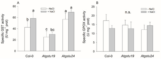 Main glutathione transferase activities of two-week-old wild-type (Col-0) and GSTU mutant (Atgstu19 and Atgstu24) Arabidopsis plants treated with 150 mM NaCl for 48 h. (A) Glutathione transferase (GST) activity, (B) glutathione peroxidase (GPOX) activity of seedlings. Means ± SD denoted by different letters indicate a significant difference between the treatments at a p < 0.05 level according to Duncan’s test.