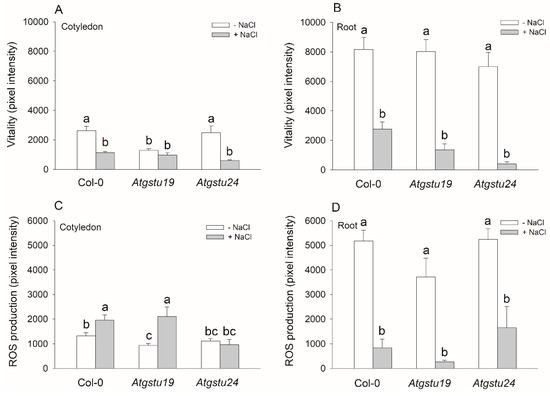 In the search for clues to understand the role of AtGSTU19 and AtGSTU24 in defence against salt stress, we focused our attention on the changes after 48 h of the 150 mM NaCl treatment of two-week-old A. thaliana plants. Correlating well with the results of earlier studies [26], we found that knockdown mutation of the AtGSTU19 gene resulted in decreased GST activity and vitality, both under control conditions and after applying 150 mM NaCl (49% in roots compared to salt-treated Col-0), but the level of total ROS was even lower than in the wild-type. The ROS level of the Atgstu24 mutant did not differ significantly from that of the Col-0 plants, and its vitality decreased only in the presence of NaCl (53% in cotyledons and 14% in roots compared to salt-treated Col-0), but interestingly, the GST activity was even higher under control conditions than in the wild-type. The GPOX activity or the level of lipid peroxidation marker MDA were not significantly altered in the investigated genotypes.