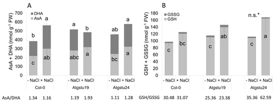 Ascorbate and glutathione contents of two-week-old wild-type (Col-0) and GSTU mutant (Atgstu19 and Atgstu24) Arabidopsis plants treated with 150 mM NaCl for 48 h. (A) The reduced ascorbic acid (AsA) and the oxidized dehydroascorbate (DHA) contents in seedlings. (B) Reduced (GSH) and oxidized (GSSG) glutathione contents in seedlings. Means ± SD. Means denoted by different letters indicate a significant difference among the treatments at a p < 0.05 level according to Duncan’s test. * n.s.—not significant. There were no significant differences in GSSG content.