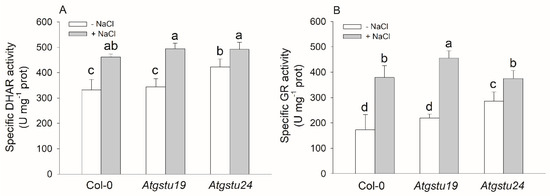 Redox-related antioxidant enzyme activities of two-week-old wild-type (Col-0) and GSTU mutant (Atgstu19 and Atgstu24) Arabidopsis plants treated with 150 mM NaCl for 48 h. (A) Dehydroascorbate reductase (DHAR) activity of seedlings. (B) Glutathione reductase (GR) activity of plants. Means ± SD denoted by different letters indicate a significant difference between the treatments at a p < 0.05 level according to Duncan’s test.