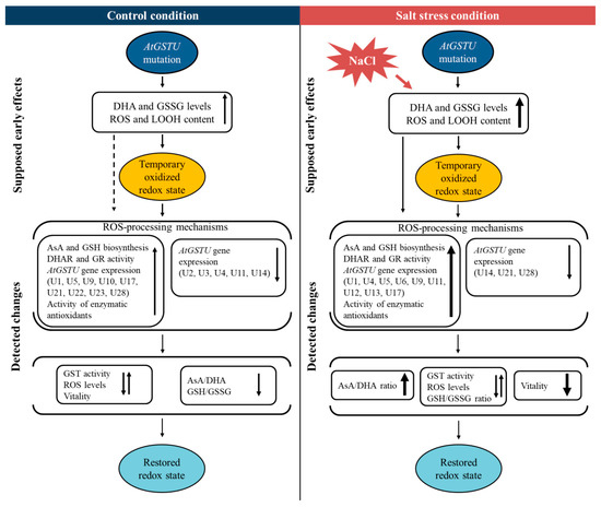 In the Atgstu19 mutant, the GSH content was also increased, but the GSH to GSSG ratio was lower than in Col-0. Interestingly, the calculated redox potential from the measured data revealed similar redox status in this mutant than in the wild-type, both under control conditions and two days after application of the salt stress (Table 2). By analysing the redox status of Arabidopsis root tips using a roGFP1 redox sensor, Jiang et al. [54] demonstrated that the immersion of seedlings in 100 mM of NaCl for 3–24 h shifted the redox potential of the entire root toward the more oxidized status at the beginning, but it was re-established after 6 h and more negative redox potentials were detected compared to control roots, especially in the case of 24 h long treatment. Generally, the redox potential of roots depended on the strength and duration of the applied stress: while it might remain more negative in the case of mild (50 mM NaCl) stress, it became more oxidized in the presence of a higher (150 mM) salt concentration. However, after a few days, the salt-induced changes in redox potentials decreased and the differences in the redox status of seedlings practically disappeared [54]. Investigation of the redox status of five-day-old Atgstu19 and Atgstf8 mutants using a roGFP2 fluorescent probe revealed that the Atgstu19 mutant had the most oxidized redox status in all root zones and under all investigated conditions [29]. Interestingly, the redox potential of the mutant roots showed smaller changes after applying 150 mM NaCl for 3 h than the wild-type, due to the fact of their already more positive value under control conditions. It was concluded that their increased salt sensitivity can be associated with the decreased redox potential response [29]. The lower GSH/GSSG ratio and increased GSH level observed in several GST mutants and overexpressing lines [41,55] and references above) suggest that altering the redox homeostasis can be part of a general mode of action in the mechanisms of GSTs. The dynamic interaction of GSTs with other glutathione-related enzymes might be how temporary redox status changes allow the regulation of normal cellular physiology. A schematic model illustrating predicted physiological and regulatory events in Atgstu mutants resulting in the observed changes in metabolite concentrations and enzyme activities under control conditions and after applying salt stress are summarized in Scheme 1.