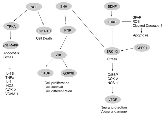 There are many different pathways that act on the cell indirectly through MAPK. One of them is the Sonic hedgehog signaling pathway (SHH), upregulated in the retina of diabetes rat models and also in Müller cells cultured under high glucose conditions. Exogenous activation of SHH showed neuroprotective effects acting via muller cells downregulating ERK1/2 or activating PI3K pathways without producing changes on p38 MAPK expression [61].