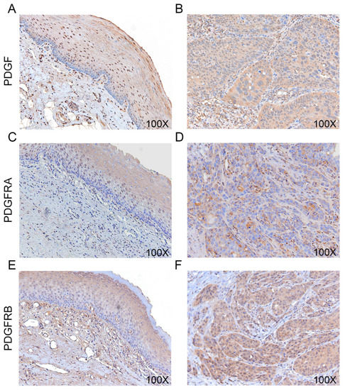 A gradual increase in PDGF, PDGFRA, and PDGFRB staining was apparent, progressing from normal-appearing oral epithelium to covering epithelium. The strongest staining was observed in invasive tumor cells. PDGF and PDGFRB immunoreactivity was present in both the cytosol and the nucleus (Figure 2B,F) while the PDGFRA immunoreactivity was present mainly in the cytosol (Figure 2D). A total of 55.6% of the tumors (35/63) showed intensive PDGF staining, 42.9% (27/63) had high PDGFRA immunoreactivity, and 41.3% (26/63) had high PDGFRB immunoreactivity (Table 2). The high expression of PDGF and PDGFRA correlated significantly with lymph node metastasis (p = 0.010 and p = 0.005, respectively; Table 2). High expression of PDGFRB was associated with lymph node metastasis (p = 0.012) and lymphovascular invasion (p = 0.047).