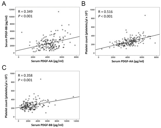 Correlation between preoperative serum PDGF-AA, PDGF-BB, and platelet count. (A) Serum PDGF-AA levels are significantly positive correlated with the expression levels of PDGF-BB. (B,C) Serum PDGF-AA and PDGF-BB correlate positively with platelet count.