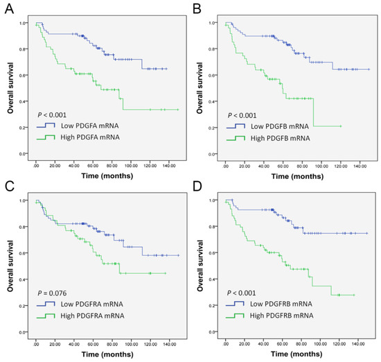 Kaplan–Meier analysis for overall patient survival according to mRNA expression of (A) PDGFA, (B) PDGFB, (C) PDGFRA, and (D) PDGFRB in OSCC. p-values were calculated by the log-rank test.
