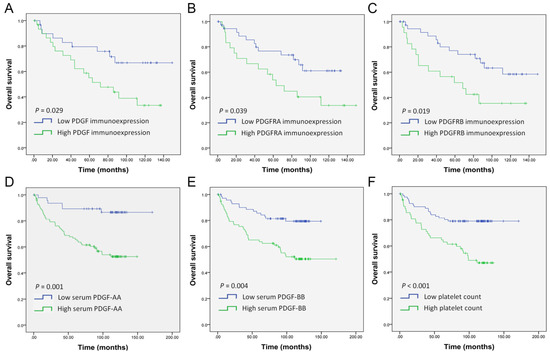 Kaplan–Meier analysis of OSCC patient survival according to predictive gene expression. (A–C) Estimation of overall survival by immunohistochemical expression of PDGF (A), PDGFRA (B), and PDGFRB (C). (D–F) Estimation of overall survival by preoperative serum levels of PDGF-AA (D), PDGF-BB (E), and platelet count (F).