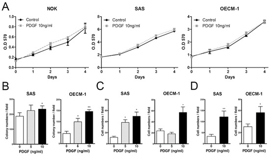 Association between PDGF treatment and oncogenic phenotypes in HNSCC cells. (A) The effect of PEGF treatment on NOK, SAS, and OECM-1 cell proliferation was examined. (B) Anchorage-independent colony formation; (C) migration assay; and (D) invasion assay. *, p < 0.05; **, p < 0.01