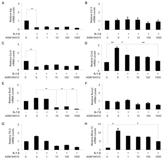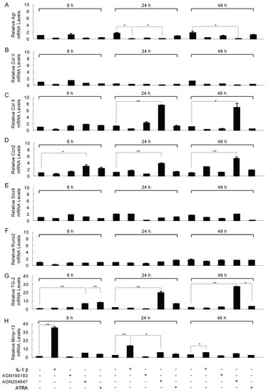 2.2. Modulation of the Expression of Chondrocyte-Specific Genes’ mRNA by IL-1β and Retinoid Receptor Agonist in ATDC5 Cells