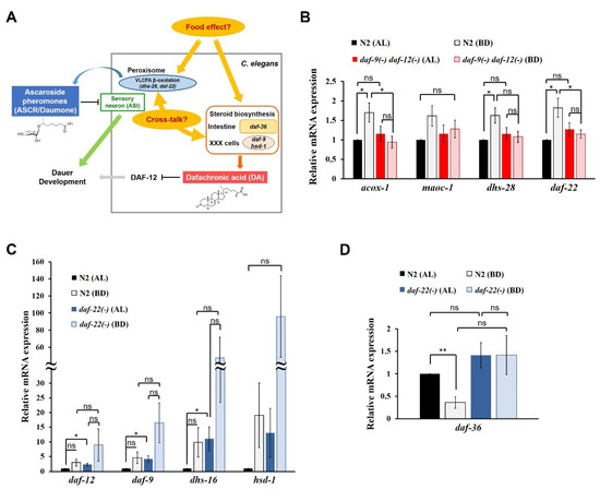 Second, to evaluate the effects of diet and ASCRs on DA biosynthesis, we examined changes in the expression levels of DA biosynthetic and DA signaling genes (daf-9, dhs-16 and hsd-1; daf-12 for DA receptor) in L4 N2 and ASCR-deficient daf-22(ok693) worms under AL and BD conditions. The expression levels of the DA genes were significantly higher in daf-22(ok693) worms compared with those in N2 worms, indicating that the presence of ASCRs may negatively regulate the expression of DA biosynthetic genes under AL conditions (Figure 1C). Note that DA gene expression appeared to increase under BD conditions compared with that in both N2 and daf-22(ok693) worms, but those changes were not significant. This effect is probably due to the high variation in the results between the independent experiments. However, these results may suggest that food deprivation can induce the expression of DA biosynthetic genes. Interestingly, the expression of daf-36, which encodes the Rieske-like oxygenase involved in Δ7-desaturation of cholesterol during DA biosynthesis [22,25], was highly suppressed in N2 worms under BD conditions compared with its level under AL conditions (Figure 1D). However, in daf-22(ok693) worms, the suppression of daf-36 expression was abolished under BD conditions, indicating that ASCRs are required for BD-mediated suppression of daf-36 expression.