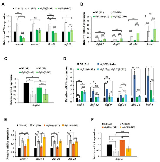 Influence of insulin/IGF-1 signaling (IIS) on the reciprocal regulation of ASCR and DA biosynthetic gene expression. (A) ASCR biosynthetic gene expression in N2 and daf-2(e1370) L4 worms under AL and BD conditions. (B) DA biosynthetic gene expression in N2 and daf-2(e1370) L4 worms under AL and BD conditions. (C) daf-36 gene expression in N2 and daf-2(e1370) L4 worms under AL and BD conditions. (D) DA biosynthetic gene expression in N2, daf-22(ok693), daf-2(e1370) and daf-22(ok693); daf-2(e1370) L4 worms under AL conditions at 15 °C. (E) ASCR biosynthetic gene expression in N2 and daf-16(mu86) L4 worms under AL and BD conditions. (F) daf-36 gene expression in N2 and daf-16(mu86) L4 worms under AL and BD conditions. Data are shown as mean ± SEM of three biologically independent experiments. * p < 0.05, ** p < 0.01, ns (not significant), were determined via one-way ANOVA analysis. See the Supplementary tables for the exact p-values.