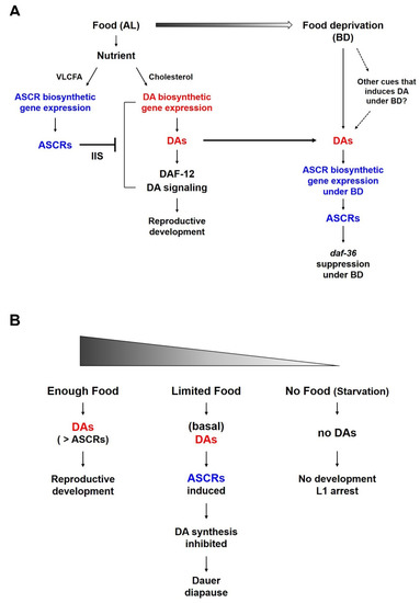 Both ASCRs and DAs are important molecules in the regulation of development, survival and aging in young worm larvae, especially in relation to dauer development. Food availability is also crucial for controlling developmental decision; there are several larval developmental processes are influenced by food availability (Figure 3B). For instance, (i) when there is enough food and the concentration of DAs is higher than that of ASCRs, worms can proceed reproductive development. (ii) When there is a limited amount of food (i.e., enough food to support L1 growth to molting into L2 larvae, but not enough to support full reproductive development), there would be only a basal level of DAs is produced due to the food limitation. This basal level of DAs can induce the ASCRs biosynthesis under BD conditions, which may result in the inhibition of DA biosynthesis (i.e., daf-36 suppression under BD conditions), as well as the entry into dauer diapause. (iii) When eggs hatch in an environment completely devoid of food, L1 worms do not have sufficient nutrients enough to develop or molt into L2 larvae and they instead arrest in L1 stage, i.e., L1 arrest.
