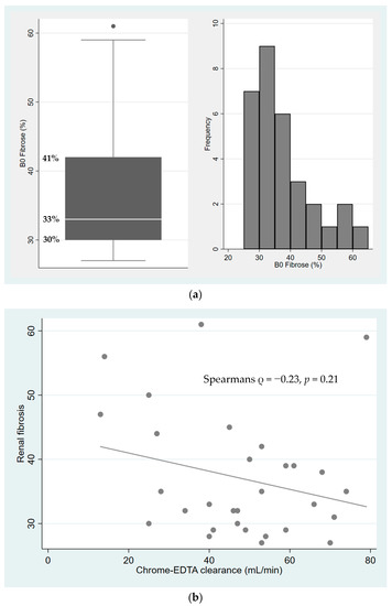 (a) The distribution of interstitial fibrosis by point counting, whiskers indicate upper and lower adjacant values, and dot represent an outlier above the upper adjacant value; (b) The association between renal function and the degree of fibrosis (Spearmans ρ = −0.23, p = 0.21).