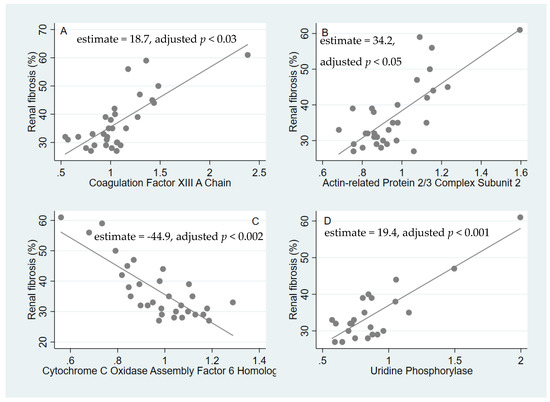 The associations of specific proteins with the degree of fibrosis. The x-axis shows the relative protein abundances (A–D).