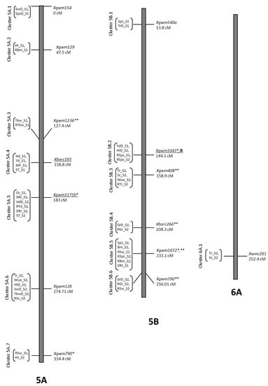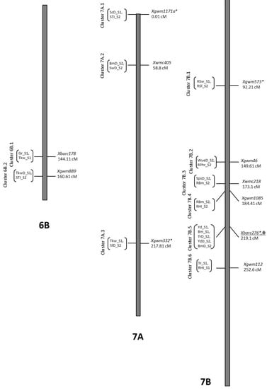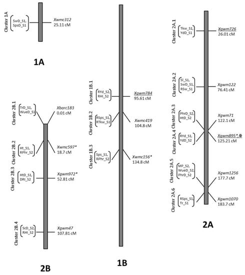 Distribution of QTL clusters in RIL population of durum wheat population. * = marker linked with a QTL in both seasons for any trait, ** = marker linked with the same trait in different conditions in a single season, ꙮ = marker linked with the same trait either in different conditions in both seasons. Markers linked with any yield QTL are under lined. For abbreviation, refer to Table 4.