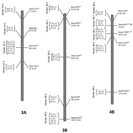 From the total of 221 QTLs, 145 could be clustered (2 or more QTLs linked to the same marker) into a total of 53 clusters (Figure 1), covering all the durum wheat chromosomes except 4A. The number of QTLs clustered together ranged between two and six. Among them, there were at least 20 markers that were associated with any trait in both seasons, whereas 10 markers were associated with the same trait under various conditions in a single season. Moreover, there were four markers that were associated with the same trait under different conditions in both seasons. It is also evident that certain Yd QTLs match exactly with Gr (cluster 5A.5), Tr (cluster 7B.5), Hd (cluster 5A.4, 5A.5), Tkw (clusters 1B.1, 2A.1), HI (cluster 3B.5), Sps (cluster 5B.2) and stress indices (clusters 5A.4, 5A.5) QTLs. Clusters of QTLs have also been reported previously [32,34,38,45,47], indicating that multiple genes might be present at such sites which can either be constitutive or expressive. Plant breeders, however, tend to look for stable loci to improve yield. Although several QTLs can be targeted for yield enhancement, the most promising one could be the clusters 2A.4 and 7B.5, where markers Xgwm895 and Xbarc276 were associated with Yd in both S1 and S2. The allelic profile of yield QTLs in these clusters indicate that allele A of Xgwm895 and allele B of Xbarc276 can enhance the Yd up to 6.16% in control and 5.27% in drought (Table 4). Moreover, if combined, a yield gain of up to 11% is possible.