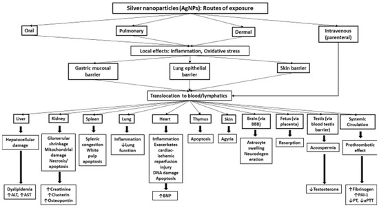 After their exposure, AgNPs are able to induce inflammation and oxidative stress at the site of exposure. Moreover, they can cross various biological barriers and enter the systemic circulation. Intravenously-administered AgNPs are directly available in circulation. From then onwards, AgNPs are distributed to various organs and cause organ-specific pathophysiological effects. It remains to be seen whether the effects observed in the distant organs are due to the direct impact of the translocated AgNPs and/or particle-induced inflammatory and oxidative stress responses at the site of exposure. Some abbreviation are as follows: alanine aminotransferase (ALT), aspartate aminotransferase (AST), brain natriuretic peptide, plasminogen activator inhibitor-1, prothrombin time, activated partial thromboplastin time, blood–brain barrier.