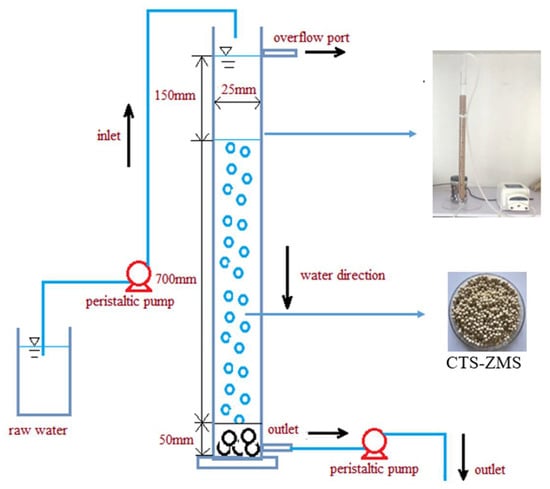 A glass round column with 25 mm of internal diameter and 1000 mm of length was filled with CTS-ZMS particles for the adsorption experiment (Figure 1). To avoid the CTS-ZMS particles outflow from the column, a 50 mm height of cobblestone was used in the bottom of the column. Before the adsorption tests, distillated water was passed through the column for about 10 min to wash the particles and adjust the flow rate. Raw water polluted by ammonium nitrogen was prepared with ammonium chloride, the concentration of NH4+-N was simulated groundwater in Shenyang, China (average NH4+-N concentration: 3–7 mg/L). Raw water was down-flow transferred by a peristaltic pump at different flow rates. During the long term running of the filter, it was backwashed according to the effluent NH4+-N concentration. When the effluent NH4+-N concentration (Ct) approached the inlet concentration (C0), i.e., Ct/C0 = 0.9, the column was backwashed by distillated water.