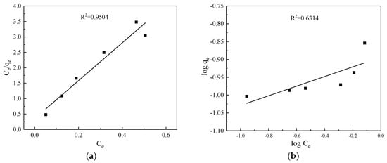 The adsorption process was commonly explained by the Langmuir (Equation (1)) [] and the Freundlich (Equation (2)) [] equations, which are listed below, respectively: