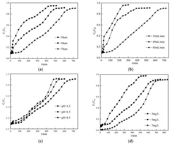 The effect of flow rate of the ammonium nitrogen solution on the CTS-ZMS dynamic filter column was investigated at the flow rates of 32, 49, 65 mL/min while maintaining the same bed depth of 70 cm, initial pH value of 6.5, influent ammonium nitrogen concentration of 5 mg/L. As shown in Figure 3b and Table 3, the breakthrough time of CTS-ZMS filter decreased with the increasing flow rate, the adsorption capacity q0 of the CTS-ZMS filter for ammonium nitrogen removal increased from 0.123 mg/g to 0.255 mg/g (Table 3) with the flow rate decreasing from 65 mL/min to 32 mL/min. The adsorption breakthrough time decreased at high flow rate and resulted in lower contact time between the ammonium nitrogen and adsorbents. In this study, optimal flow rate was chosen as 32 mL/min.