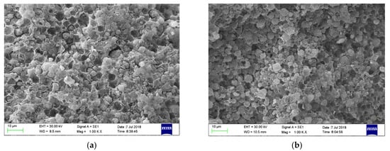 Figure 4a,b illustrated the surface morphology of new CTS-ZMS adsorbent and after running 3 months adsorbed with ammonium nitrogen from the filter column at 1000 magnification, respectively. The surface of CTS-ZMS adsorbent was composed of cubic crystals with regular morphology, which conformed to the morphology of the zeolite NaA type []. According to the detection result of BET, the surface area, the average pore diameter and pore volume of CTS-ZMS were 20.782 m2/g, 3.56 nm and 0.097 cm3/g, respectively. The chitosan was loaded on the surface of the zeolite molecular sieve, therefore the CTS-ZMS surface was formed with more concavo-convex structure and the larger pores. After running three months, there were no obvious changes in the morphology of the CTS-ZMS.