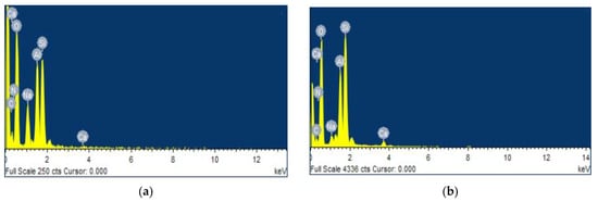 Energy dispersive X-ray spectroscopy (EDS) of the CTS-ZMS samples before and after ammonium nitrogen adsorption: (a) CTS-ZMS; (b) ammonium nitrogen adsorbed CTS-ZMS.