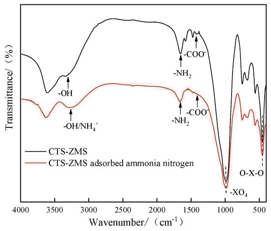 FTIR spectra from the scanning range 4000 to 400 cm−1 of CTS-ZMS adsorbent before and after ammonium nitrogen adsorption were shown in Figure 6. The FTIR spectra of the CTS-ZMS (red line and black line) illustrated the band at 1654 cm−1 corresponded to the -NH2 bond of the amine group while the band at 1418 cm−1 was attributed to -COO− bond, these two bands indicated the typical group of chitosan []. The strong bands at 992 cm−1 and 453 cm−1 were caused by –XO4 and O–X–O groups, respectively (X means Si/Al), and the band at 3332 cm−1 corresponded to the Si-OH group and Al-OH group on the surface of zeolite molecular sieve framework []. The results showed that the chitosan had been successfully loaded onto the surface of zeolite molecular sieve.