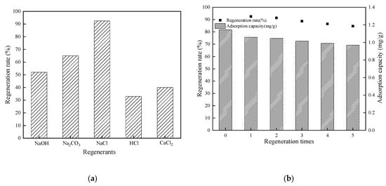 The regeneration rates of the CTS-ZMS absorbents by NaOH, Na2CO3, HCl, CaCl2 and NaCl were 52%, 65%, 33%, 40% and 92.5%, respectively (Figure 8a), which indicated NaCl solution was the most efficient regenerant. Figure 8b showed the regeneration rates of CTS-ZMS by NaCl after different regeneration times. The initial adsorption capacity of CTS-ZMS was 1.145 mg/g. After 5 times regeneration, the adsorption capacity of CTS-ZMS was 0.97 mg/g and regeneration rate was 84.7% (Figure 8b). This proved that NaCl had a good regeneration effect on CTS-ZMS, and it still had good adsorption performance after 5 regenerations.