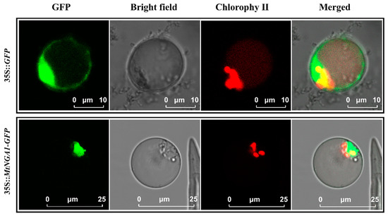 PlantTFDB and UniProt predicted that MtNGA1 is a transcription factor in the nucleus. An MtNGA1-GFP fusion protein was expressed in M. truncatula protoplast cells as described by Yoo [26]. The GFP signal in the protoplasts was detected by confocal laser scanning microscopy. The results showed that a strong GFP signal was only detected from the nucleus when the MtNGA1-GFP fusion protein was overexpressed, while the GFP signal was found throughout the whole cell in cells expressing the GFP protein (Figure 2). These results suggested that MtNGA1 is a nuclear protein, which is consistent with the predicted results.