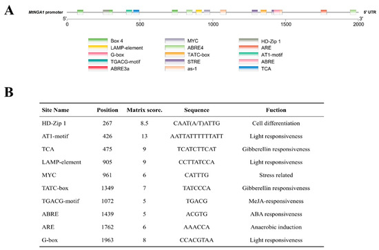 To analyze the potential function and regulatory pathway of MtNGA1, we obtained the 5′ upstream sequence (2000 bp in length) of the MtNGA1 gene from NCBI and then identified cis-acting elements in the region with PlantCARE. The results showed that the most abundant binding sites were present in the region involved in stress resistance and light responses (Figure 3), which indicated that this gene may act as a regulator in stress.