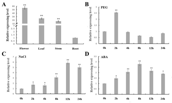 Expression profiles of MtNGA1 in M. truncatula. (A) Relative expression levels of MtNGA1 in different plant organs: the flowers, leaves, stems, and roots. (B) Relative expression levels of MtNGA1 under 15% Polyethylene Glycol (PEG) treatments. (C) Relative expression levels of MtNGA1 under 200 mM NaCl treatment. (D) Relative expression levels of MtNGA1 under 100 µM ABA treatment. All samples were harvested at 0 h, 2 h, 4 h, 8 h, 12 h, and 24 h. The values are the means ± standard deviations (SDs; n = 3). * indicates significant differences of the means at p < 0.05 between flower, leaf or stem expression and root expression determined by expression analysis (n = 3). ** indicates significant differences of the means at p < 0.01 between each treated sample and untreated sample determined by expression analysis (n = 3).