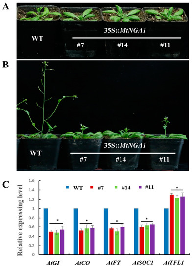 Previous studies have shown that NGA genes play an essential role in gynoecium development, lateral organ growth and cell proliferation. EcNGA and NbNGA regulate development of the style, stigma and perianth, and the carpel [30]. Four NGA genes in Arabidopsis have a general function in the regulation of lateral organ growth, such as the growth of shorter and wider sepals and petals, and wider and more serrated rosette leaves [21,22]. Because BrNGA1 negatively regulates the rate and duration of cell proliferation during organogenesis, Arabidopsis plants overexpressing BrNGA1 contained smaller and narrower leaves, flowers and cotyledons than wild-type plants and severely retarded root growth [17]. Overexpression of MtNGA1 in Arabidopsis plants retarded reproductive growth and decreased the number of bolting. The three transgenic Arabidopsis lines bolted 8–10 days later than wild-type Arabidopsis. Then, we detected the expression of flowering related genes: AtGI, AtCO, AtFT, AtSOC1 and AtTFL1 in transgenic MtNGA1 plants under normal conditions. The FLAVIN-BINDING, KELCH REPEAT, F-BOX 1 (FKF1-GI) complex binds the CO promoter [33], and then regulates CO transcription expression [34]. CO is an immediate activator of FT [35]. SOC1 acts downstream of FT, and the activation of SOC1 is conducive to the expression of FT in the leaves to the meristem, initiating flowering [34]. However, TFL1 has the opposite regulatory effect, and represses flowering [35]. Our results showed that the expression of AtGI, AtCO, AtFT and AtSOC1 was downregulated, while the expression of AtTFL1 was upregulated in MtNGA1 transgenic lines compared to wild-type plants under normal growth conditions. These results demonstrated that MtNGA1 is involved in the long-distance signaling pathway of flowering.